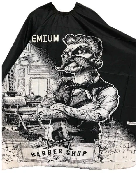 Designerska peleryna fryzjerska ze specjalnym przeznaczeniem dla męskiej części społeczności fryzjerskiej.